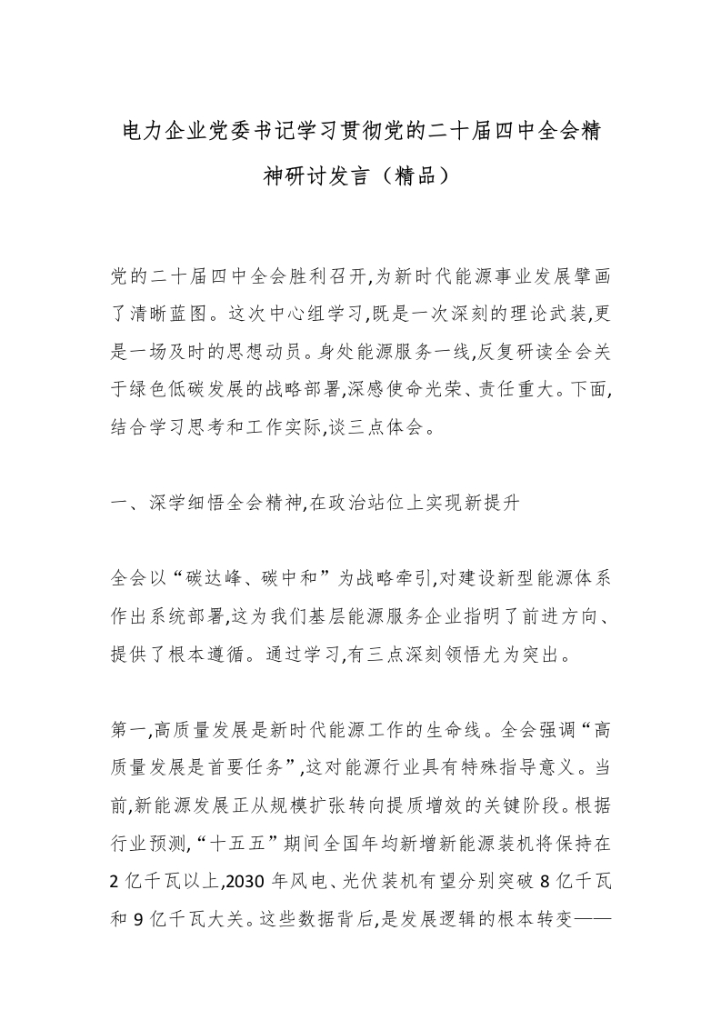 首页精选范文电力企业党委书记学习贯彻党的二十届四中***精神研讨发言(精品)_副本
