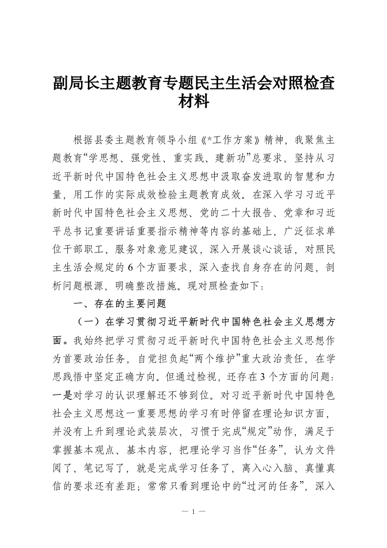 副局长主题教育专题民主生活会对照检查材料
