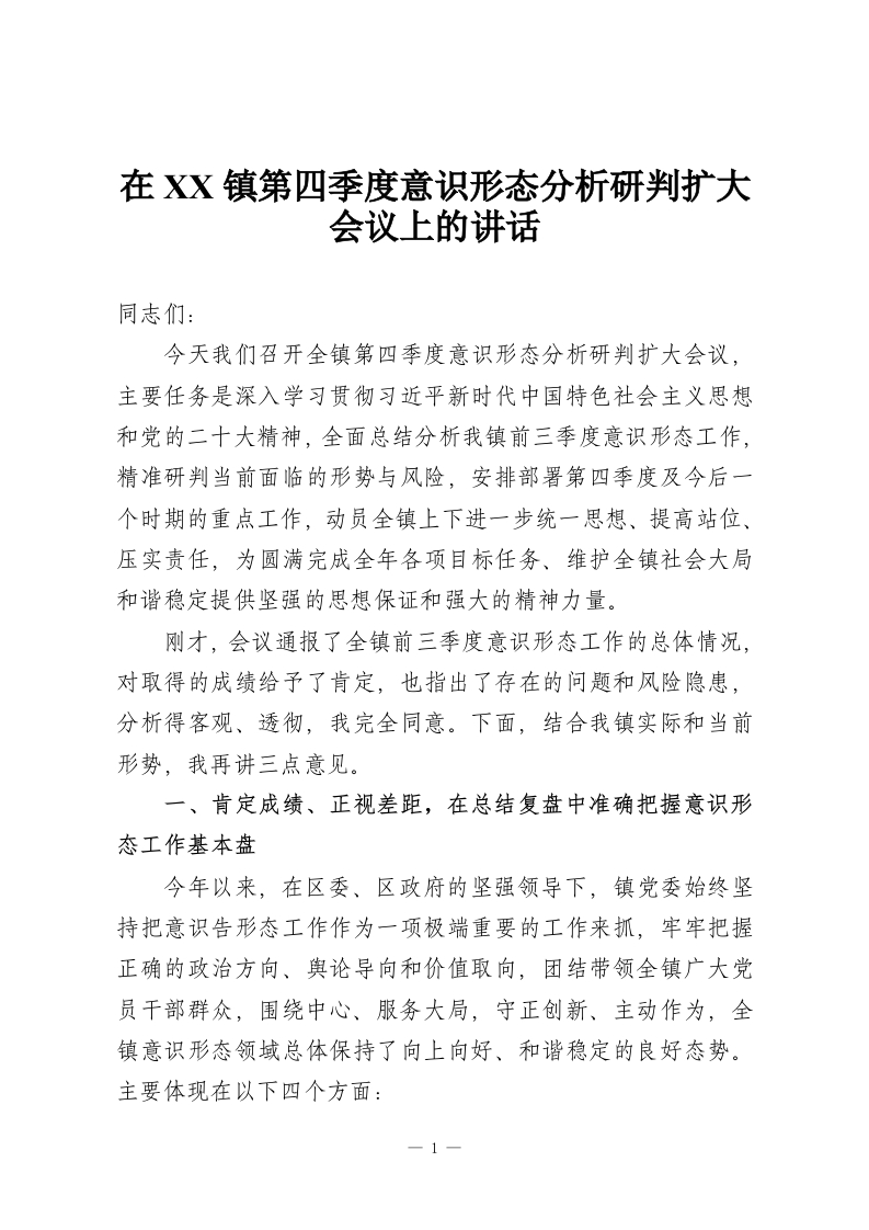 在XX镇第四季度意识形态分析研判扩大会议上的讲话