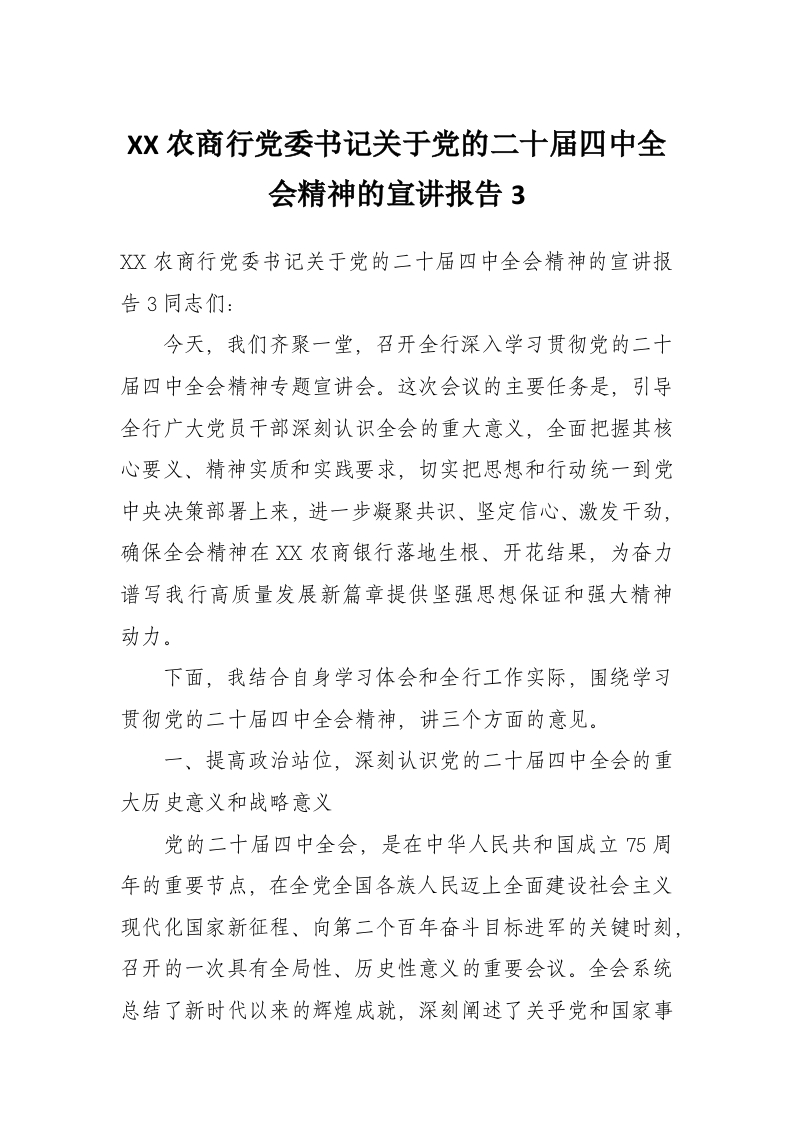首页讲课讲稿XX农商行党委书记关于党的二十届四中***精神的宣讲报告3
