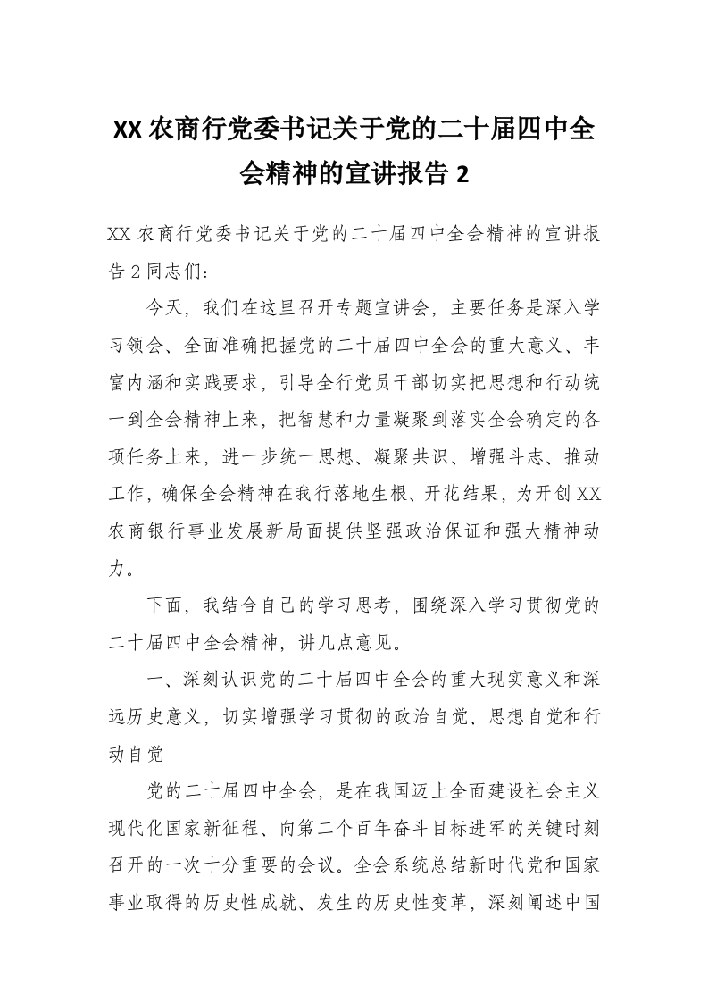 首页讲课讲稿XX农商行党委书记关于党的二十届四中***精神的宣讲报告2