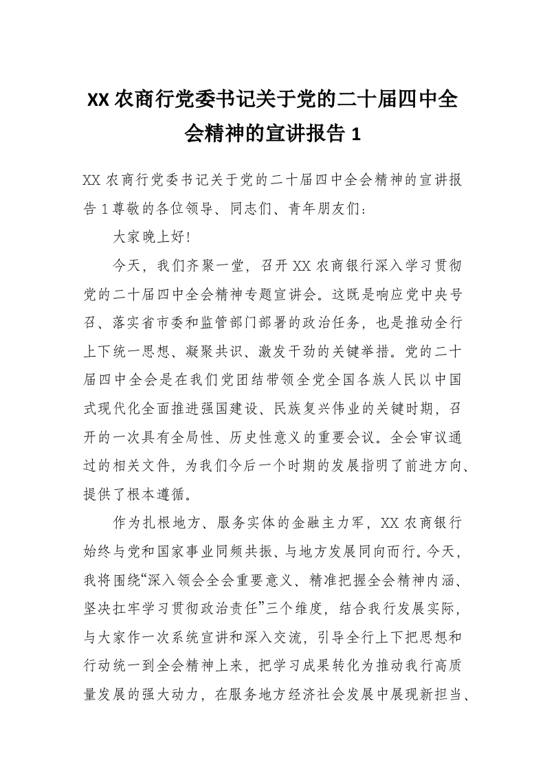 首页讲课讲稿XX农商行党委书记关于党的二十届四中***精神的宣讲报告1