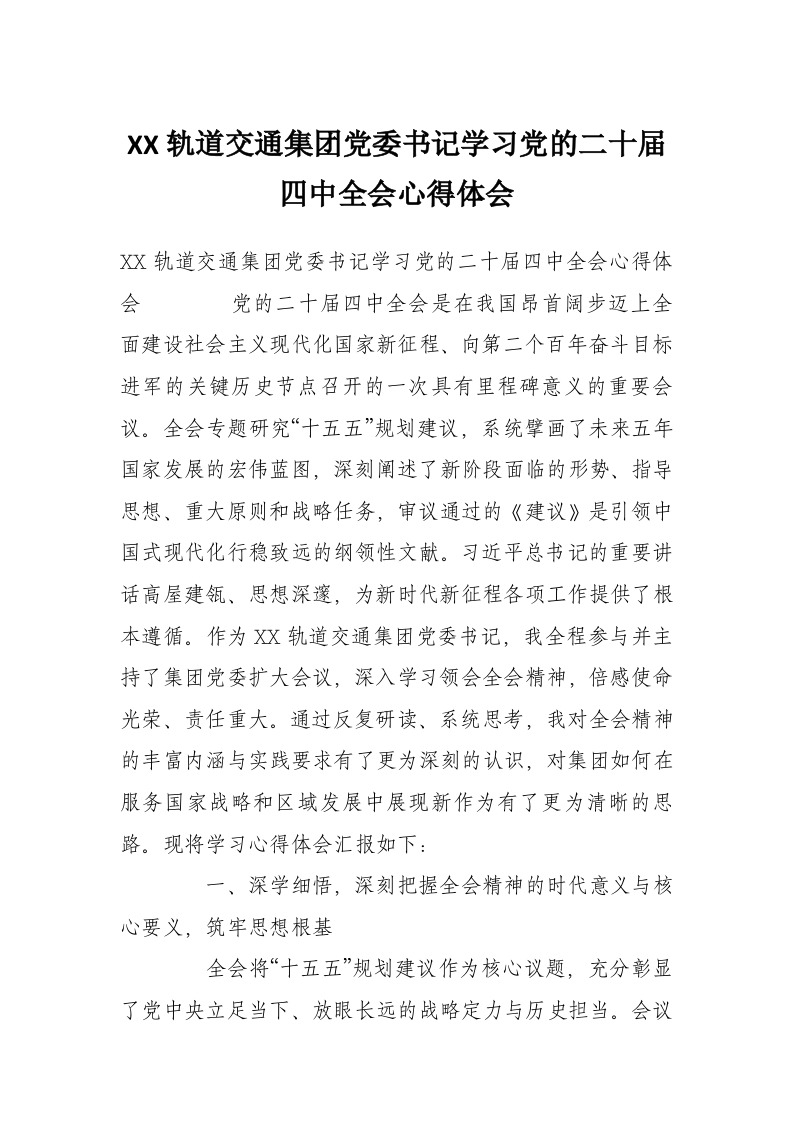 XX轨道交通集团党委书记学习党的二十届四中***心得体会