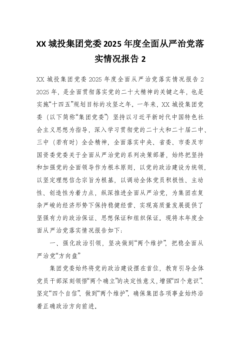 XX城投集团党委2025年度全面从严治党落实情况报告2