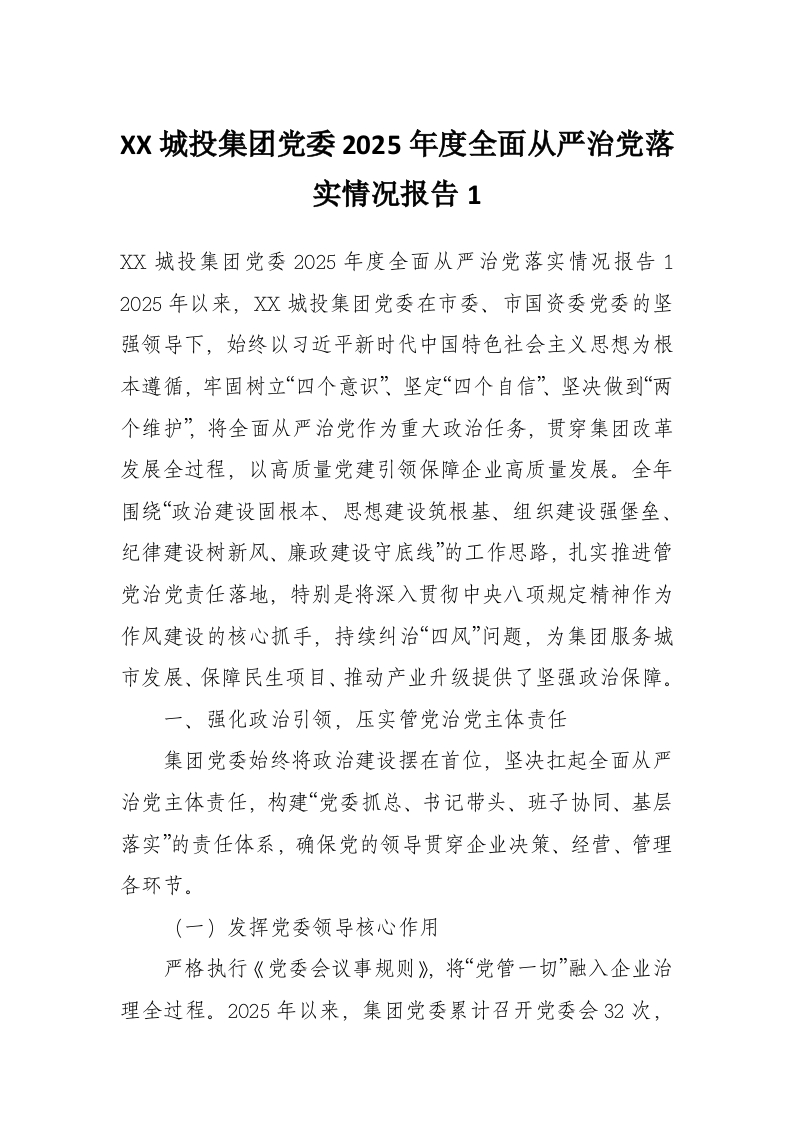 XX城投集团党委2025年度全面从严治党落实情况报告1