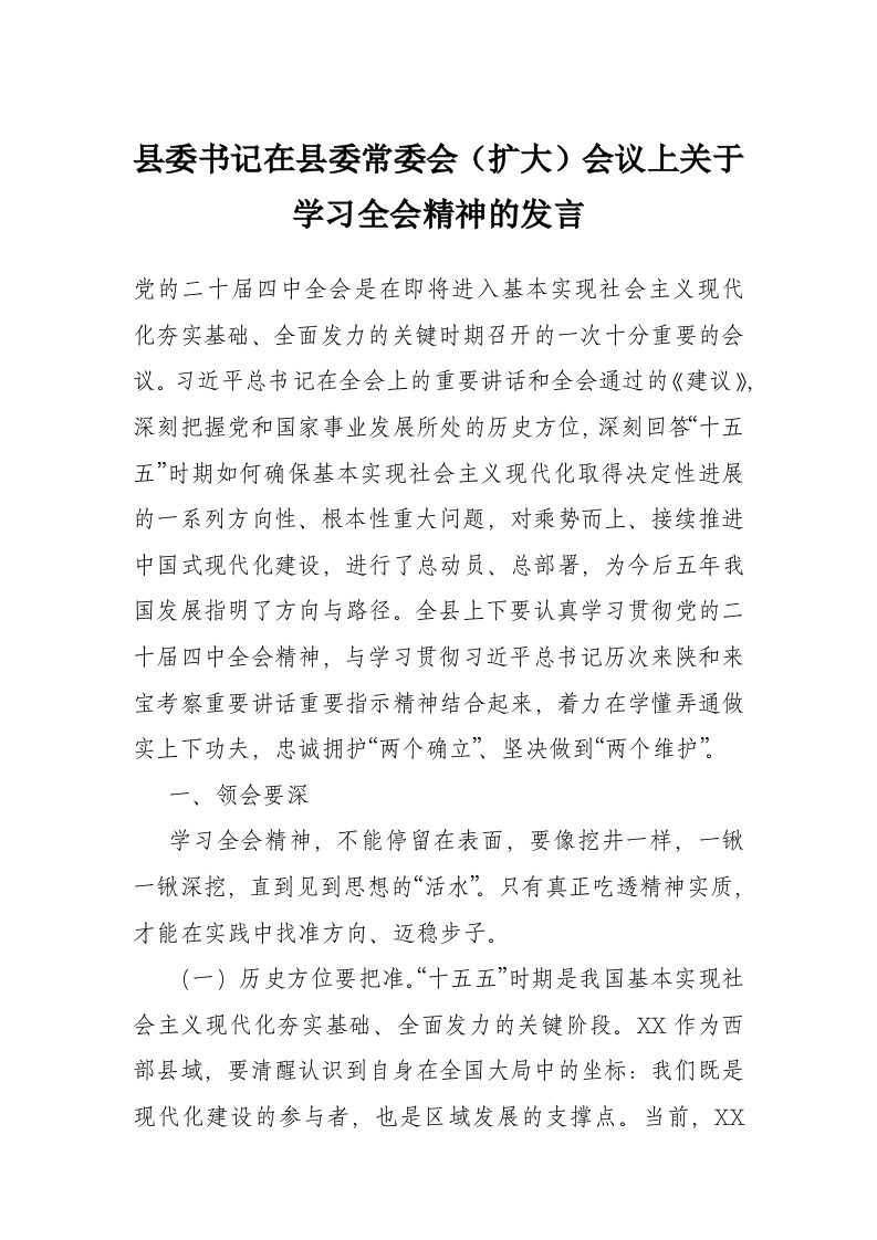 县委书记在县委常委会(扩大)会议上关于学习***精神的发言