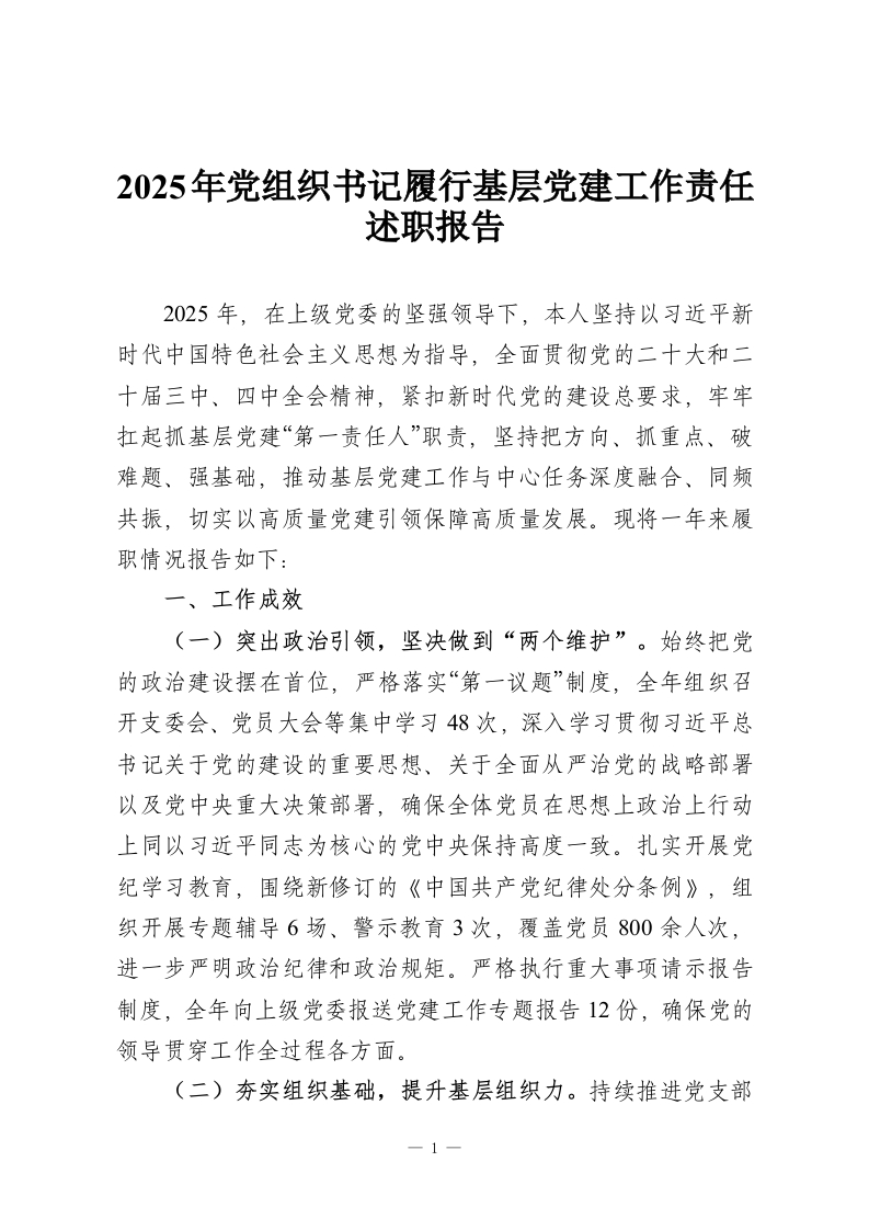 首页工作文档2025年党组织书记履行基层党建工作责任述职报告
