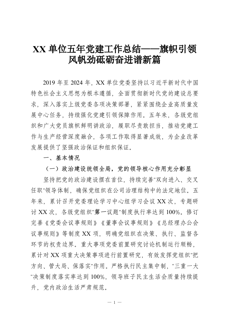 XX单位五年党建工作总结——旗帜引领风帆劲砥砺奋进谱新篇
