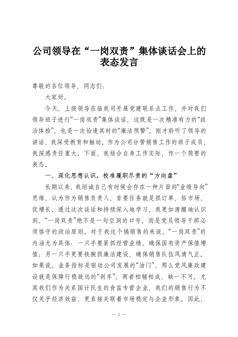 公司领导在“一岗双责”集体谈话会上的表态发言