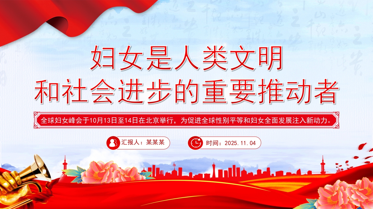 首页PPT模板党政风妇女是人类文明和社会进步的重要推动者PPT课件下载