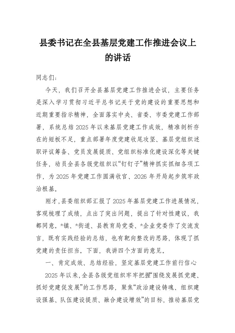 县委书记在全县基层党建工作推进会议上的讲话