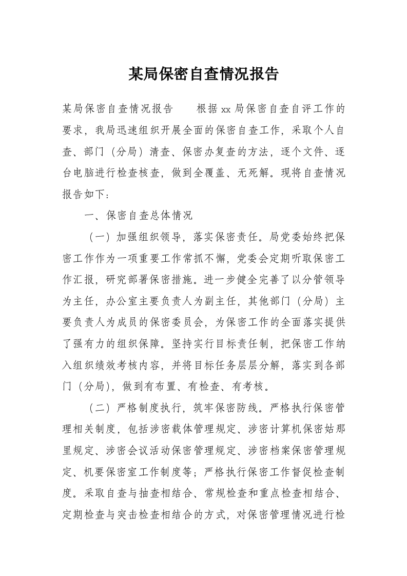 某局保密自查情况报告