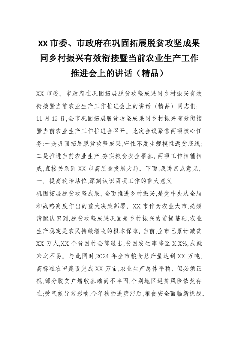 XX市委、市***在巩固拓展脱贫攻坚成果同乡村振兴有效衔接暨当前农业生产工作推进会上的讲话(精品)