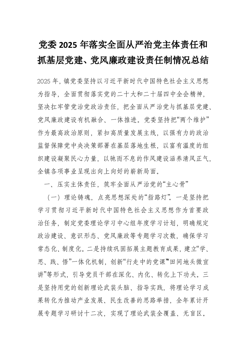 首页写作素材党委2025年落实全面从严治党主体责任和抓基层党建、党风廉政建设责任制情况总结