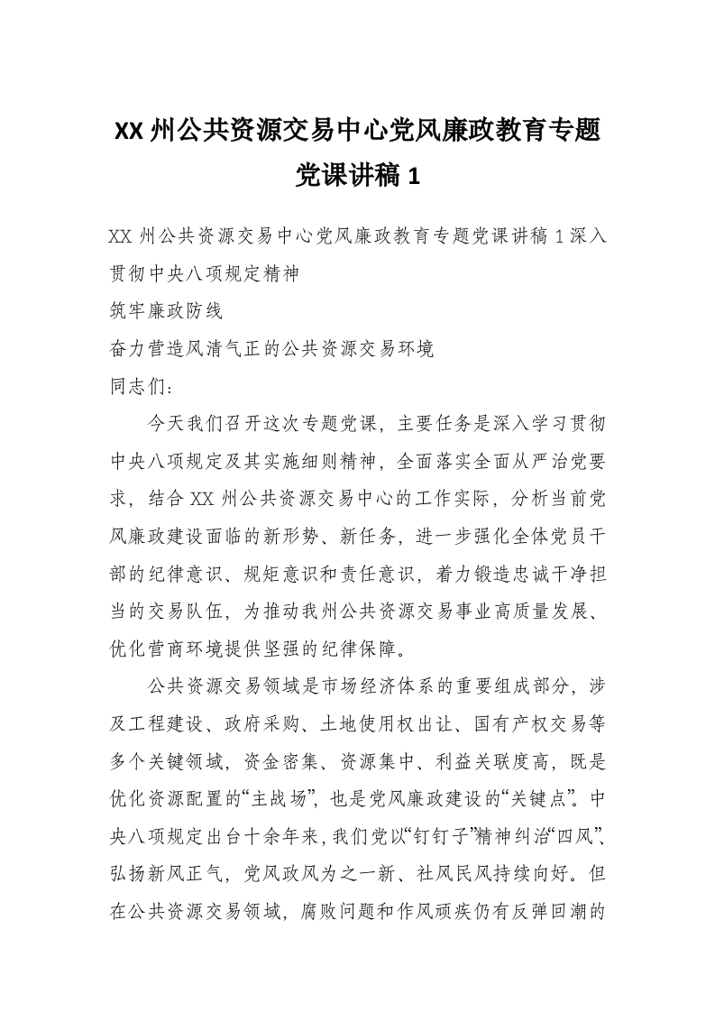 XX州公共资源交易中心党风廉政教育专题党课讲稿1
