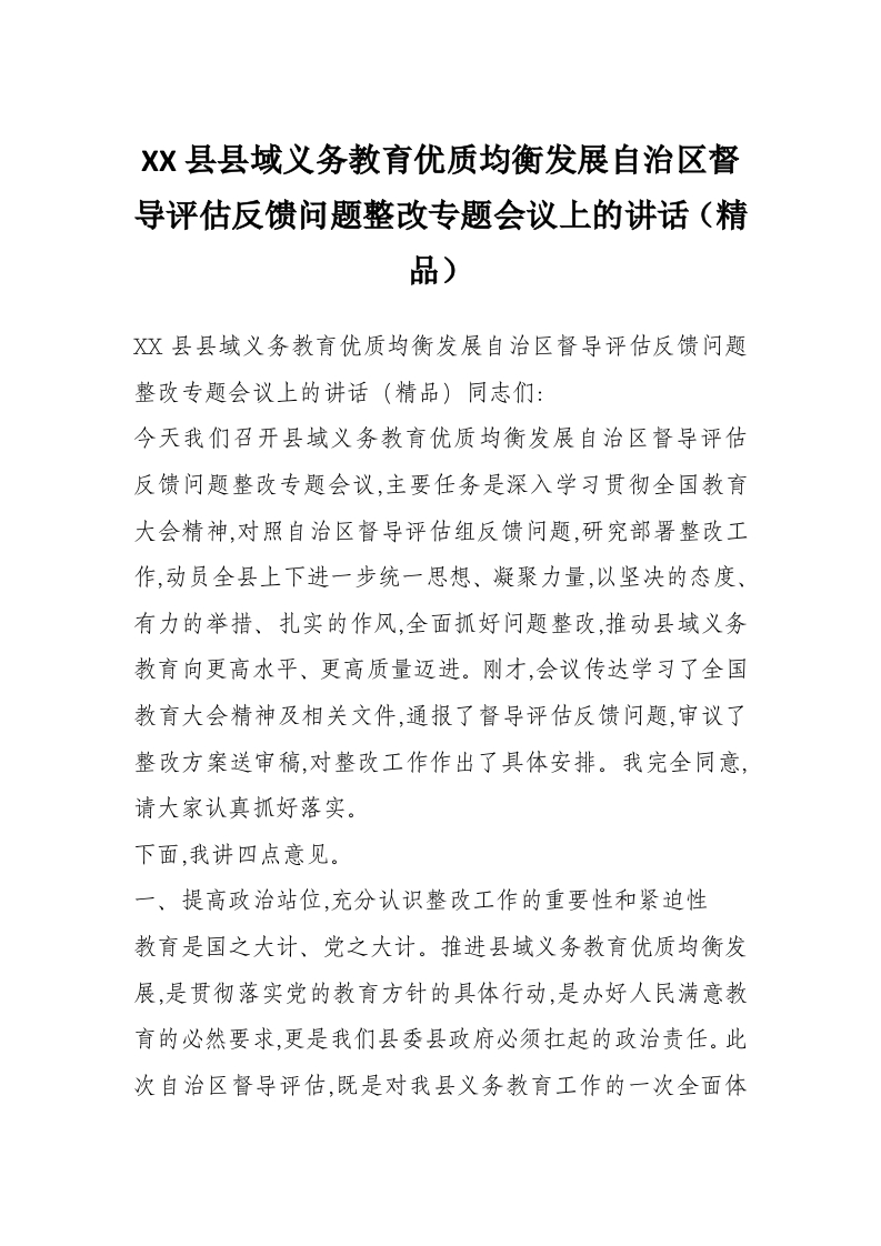 XX县县域义务教育优质均衡发展自治区督导评估反馈问题整改专题会议上的讲话(精品)