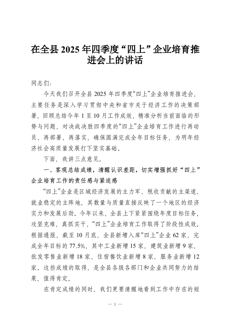 在全县2025年四季度“四上”企业培育推进会上的讲话