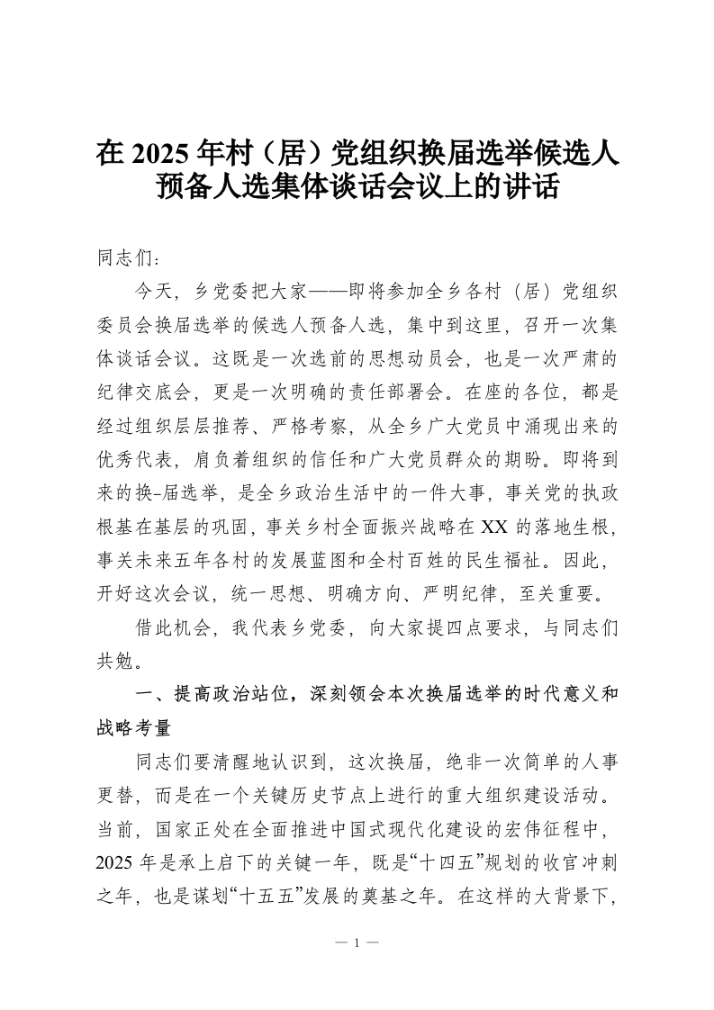 在2025年村(居)党组织换届选举候选人预备人选集体谈话会议上的讲话