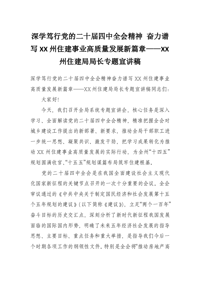 深学笃行党的二十届四中***精神 奋力谱写XX州住建事业高质量发展新篇章——XX州住建局局长专题宣讲稿