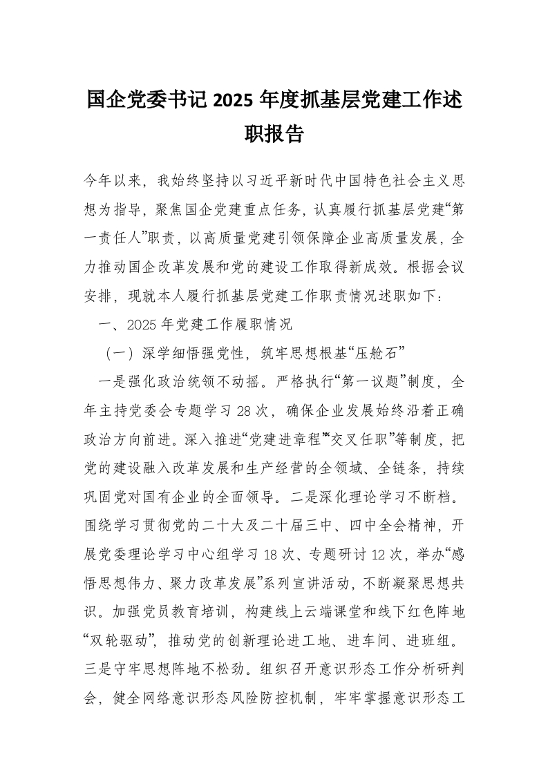 国企党委书记2025年度抓基层党建工作述职报告
