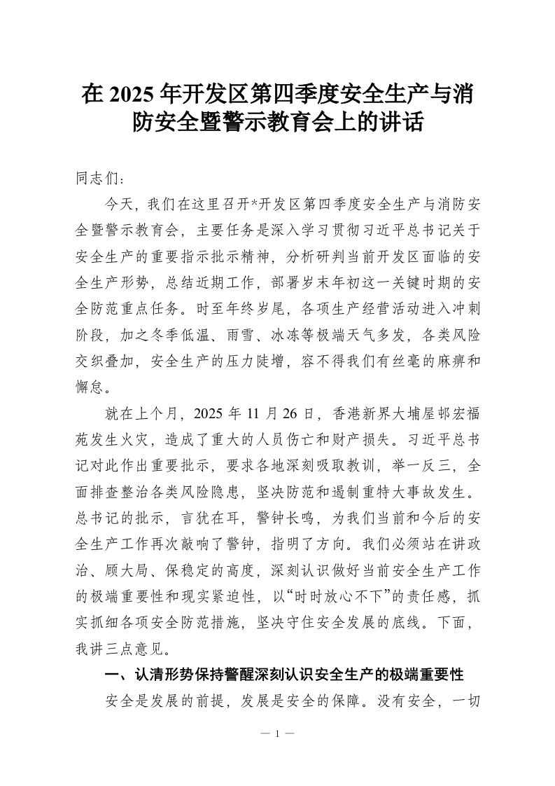 在2025年开发区第四季度安全生产与消防安全暨警示教育会上的讲话