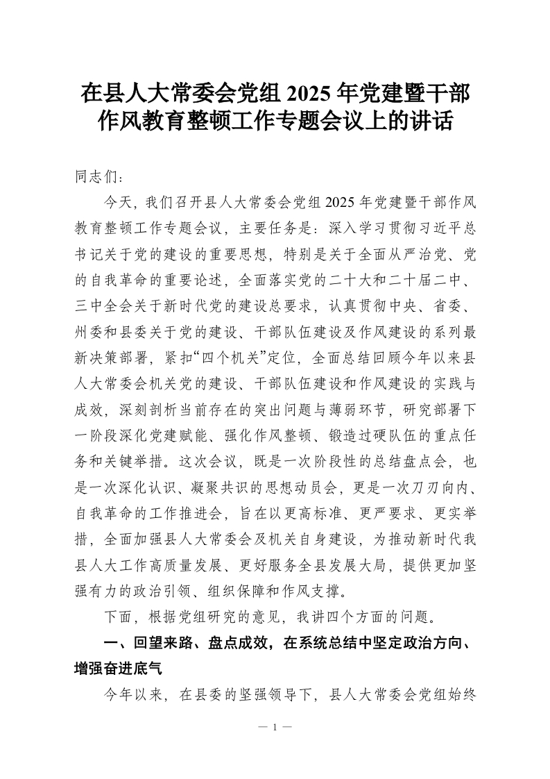 在县人大常委会党组2025年党建暨干部作风教育整顿工作专题会议上的讲话