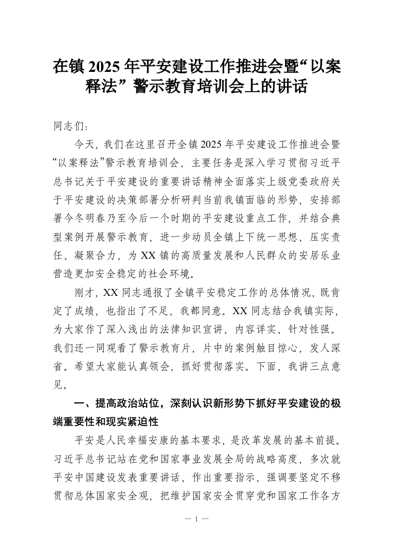 在镇2025年平安建设工作推进会暨“以案释法”警示教育培训会上的讲话