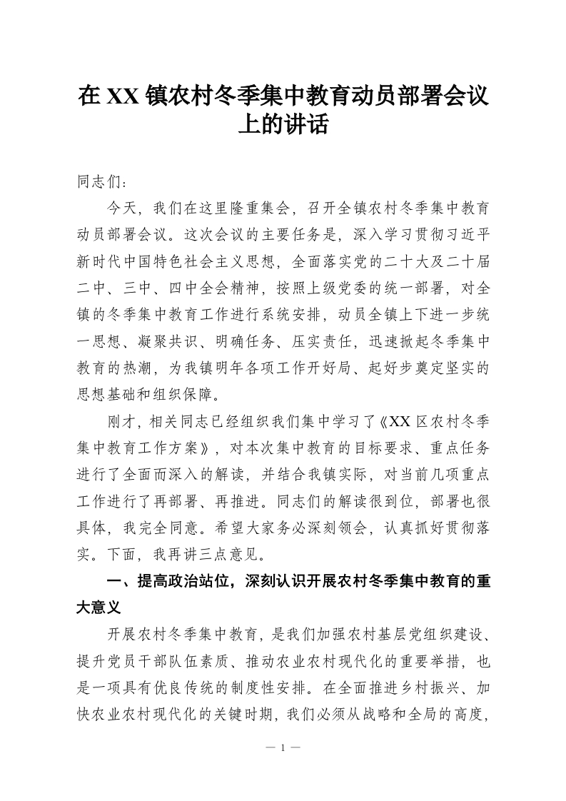 在XX镇农村冬季集中教育动员部署会议上的讲话