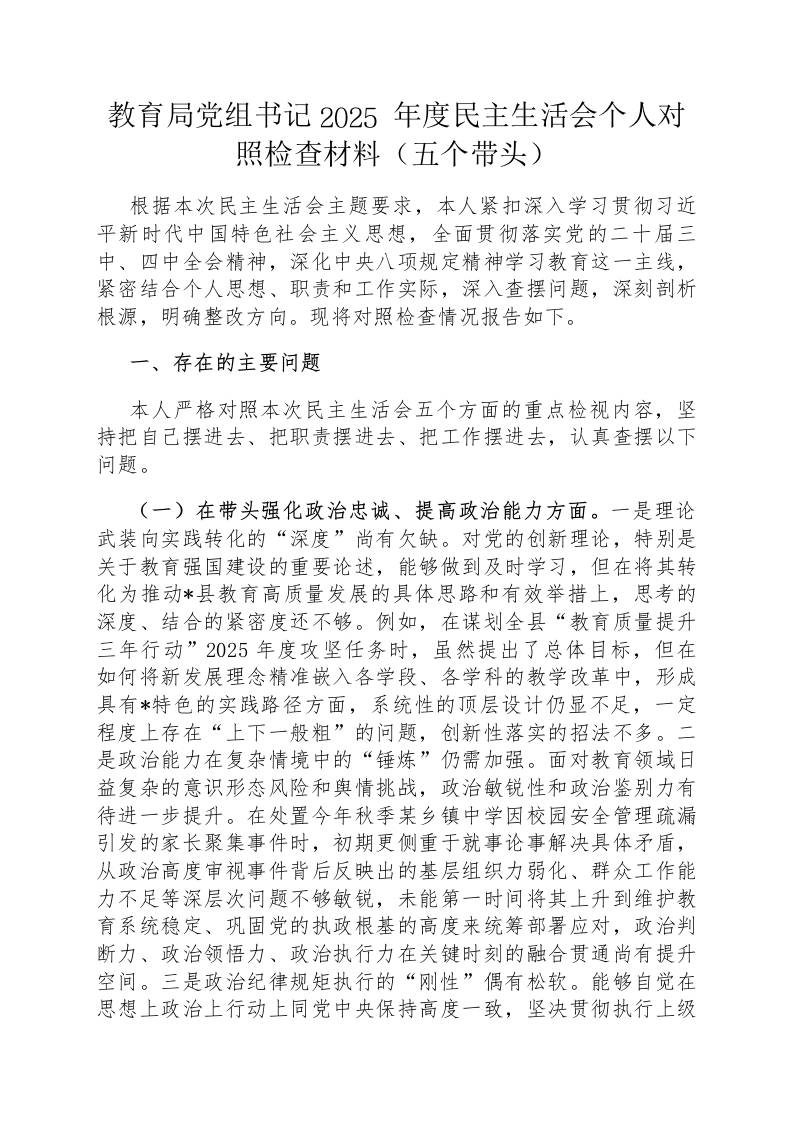 首页材料汇编教育局党组书记2025年度民主生活会个人对照检查材料(五个带头)