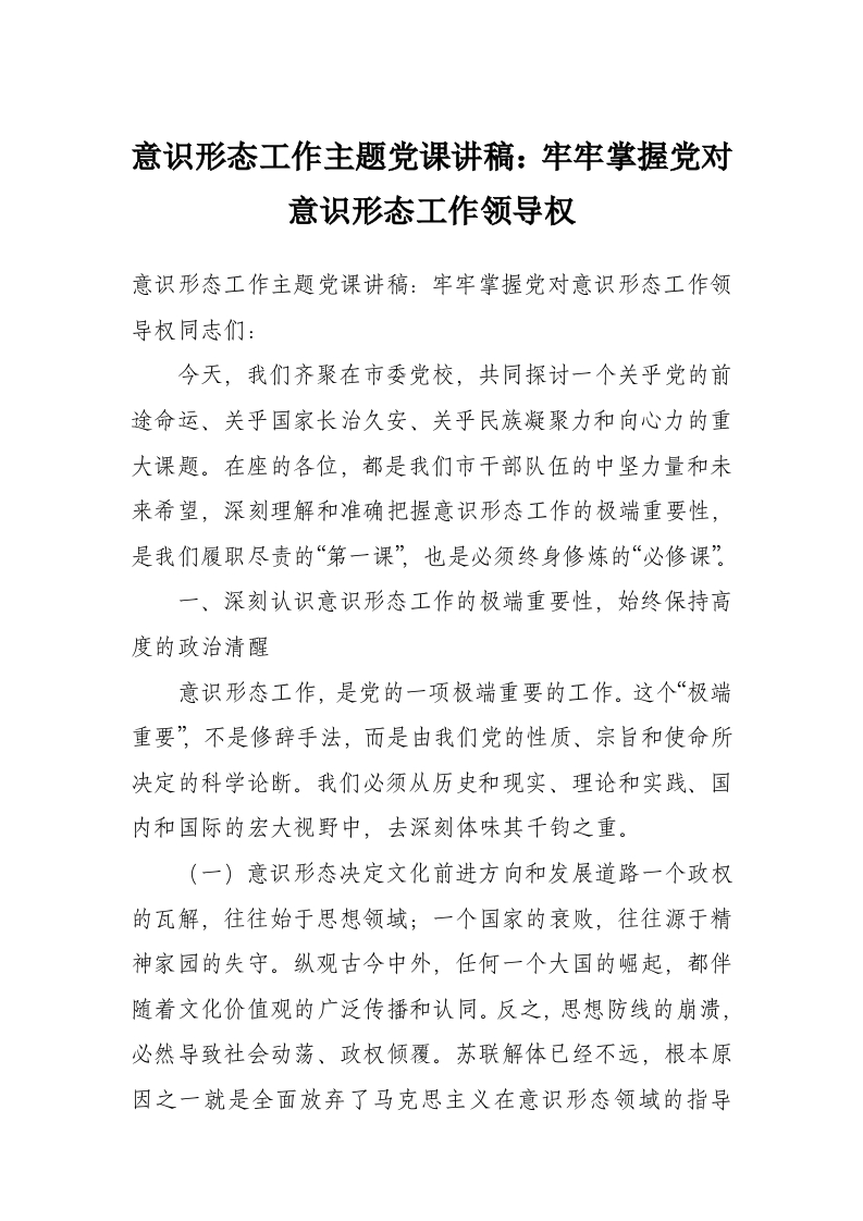 首页材料汇编意识形态工作主题党课讲稿:牢牢掌握党对意识形态工作领导权