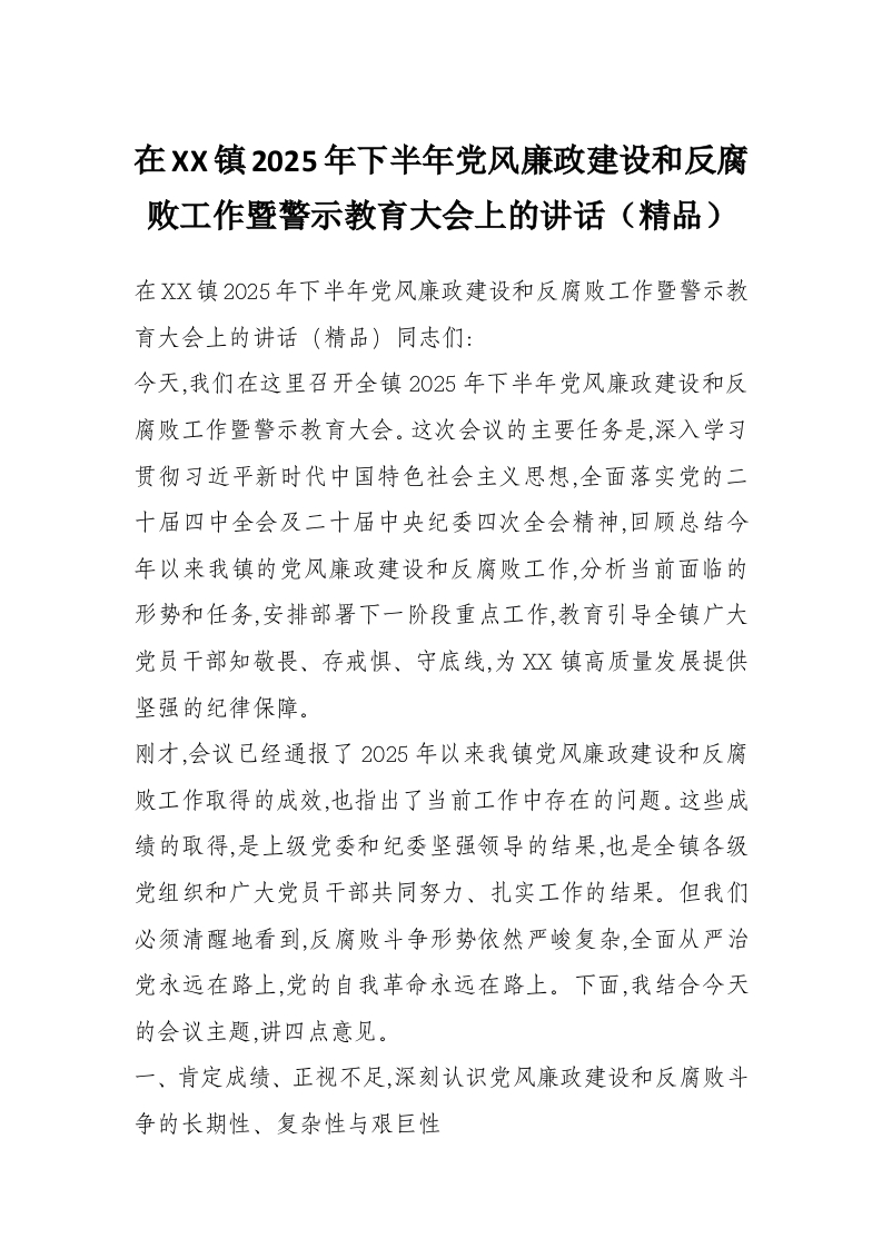 在XX镇2025年下半年党风廉政建设和反腐败工作暨警示教育大会上的讲话(精品)