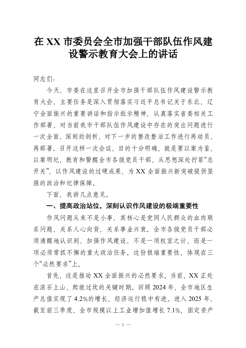 在XX市委员会全市加强干部队伍作风建设警示教育大会上的讲话