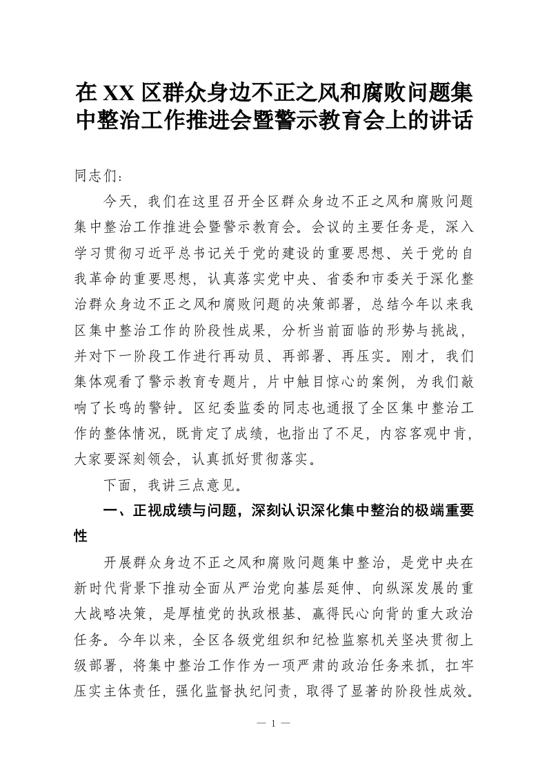 在XX区群众身边不正之风和腐败问题集中整治工作推进会暨警示教育会上的讲话