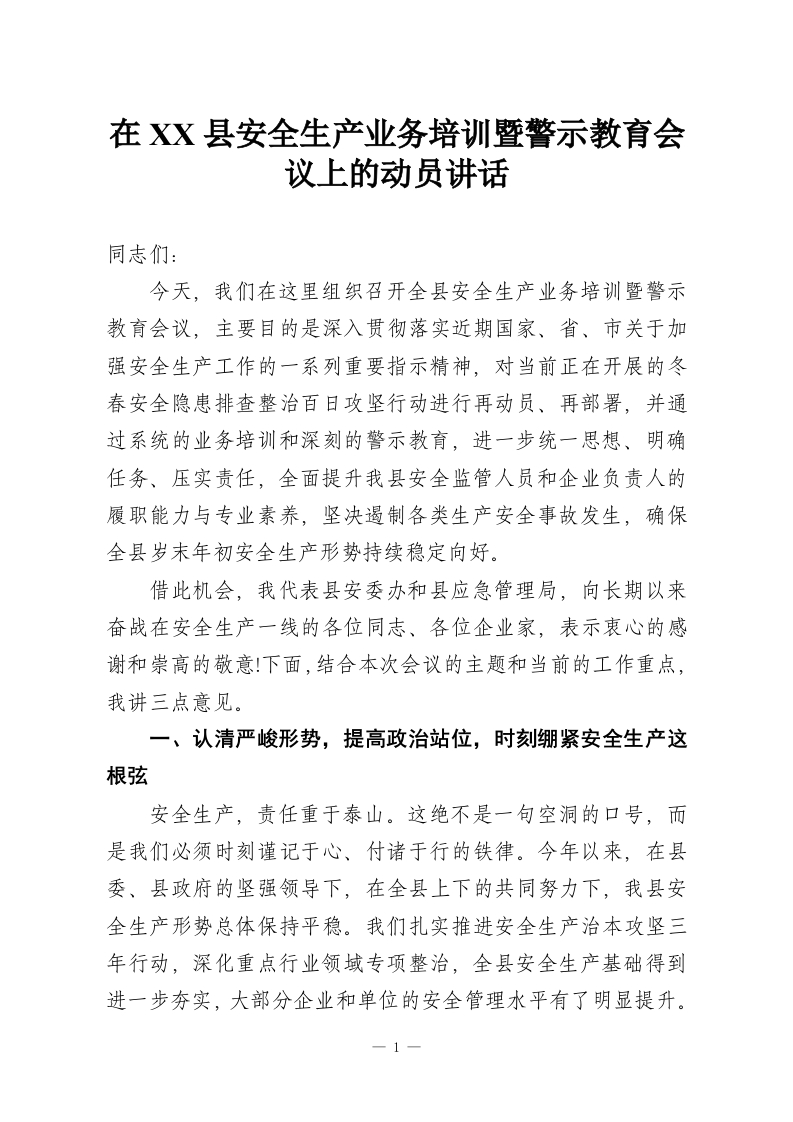 在XX县安全生产业务培训暨警示教育会议上的动员讲话