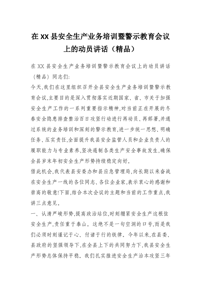 在XX县安全生产业务培训暨警示教育会议上的动员讲话(精品)