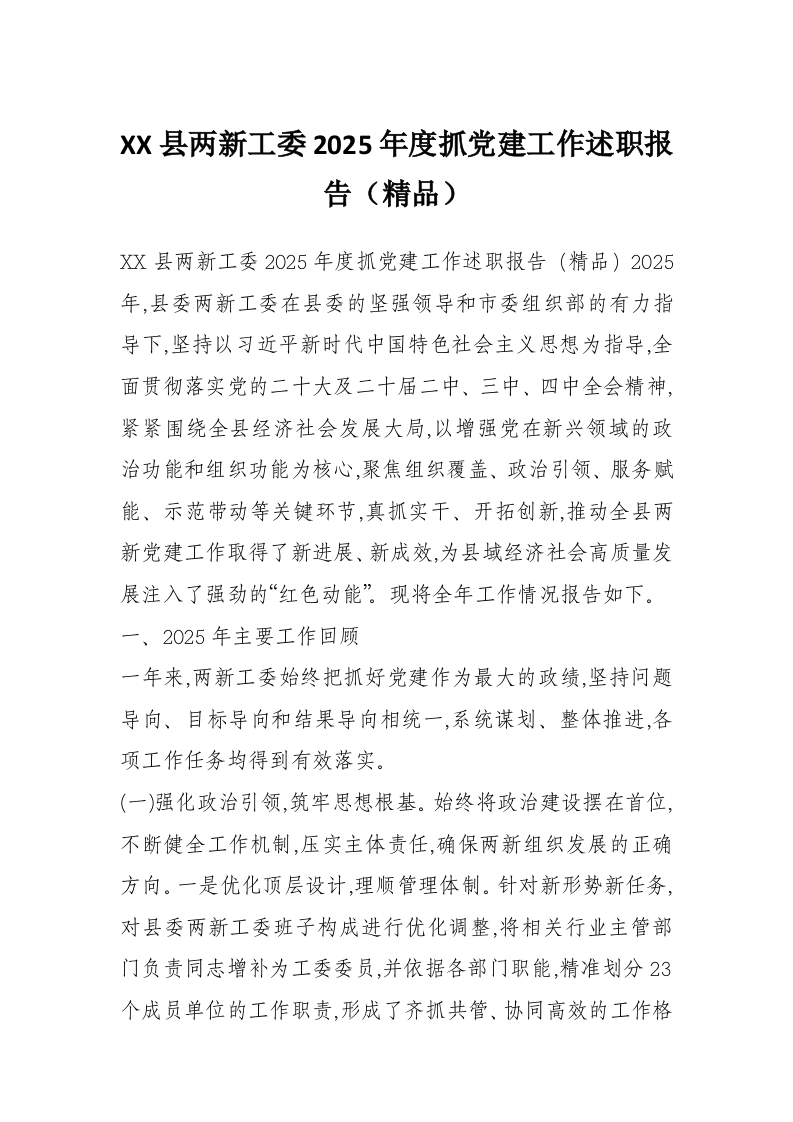 XX县两新工委2025年度抓党建工作述职报告(精品)