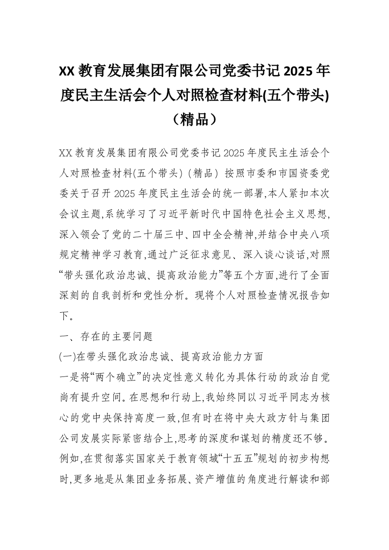XX教育发展集团有限公司党委书记2025年度民主生活会个人对照检查材料(五个带头)(精品)