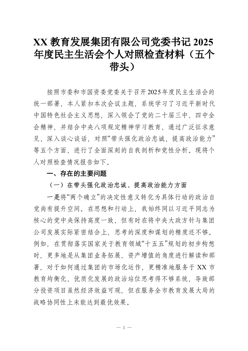 XX教育发展集团有限公司党委书记2025年度民主生活会个人对照检查材料(五个带头)