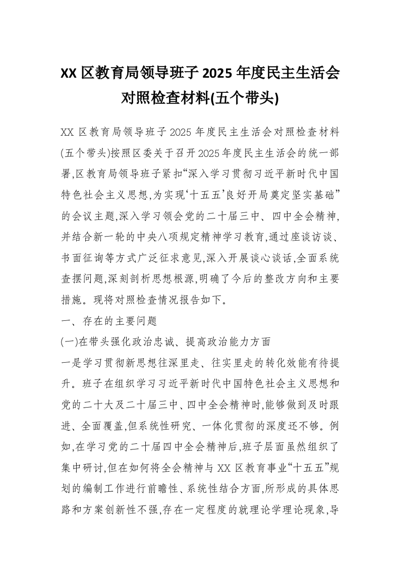 XX区教育局领导班子2025年度民主生活会对照检查材料(五个带头)