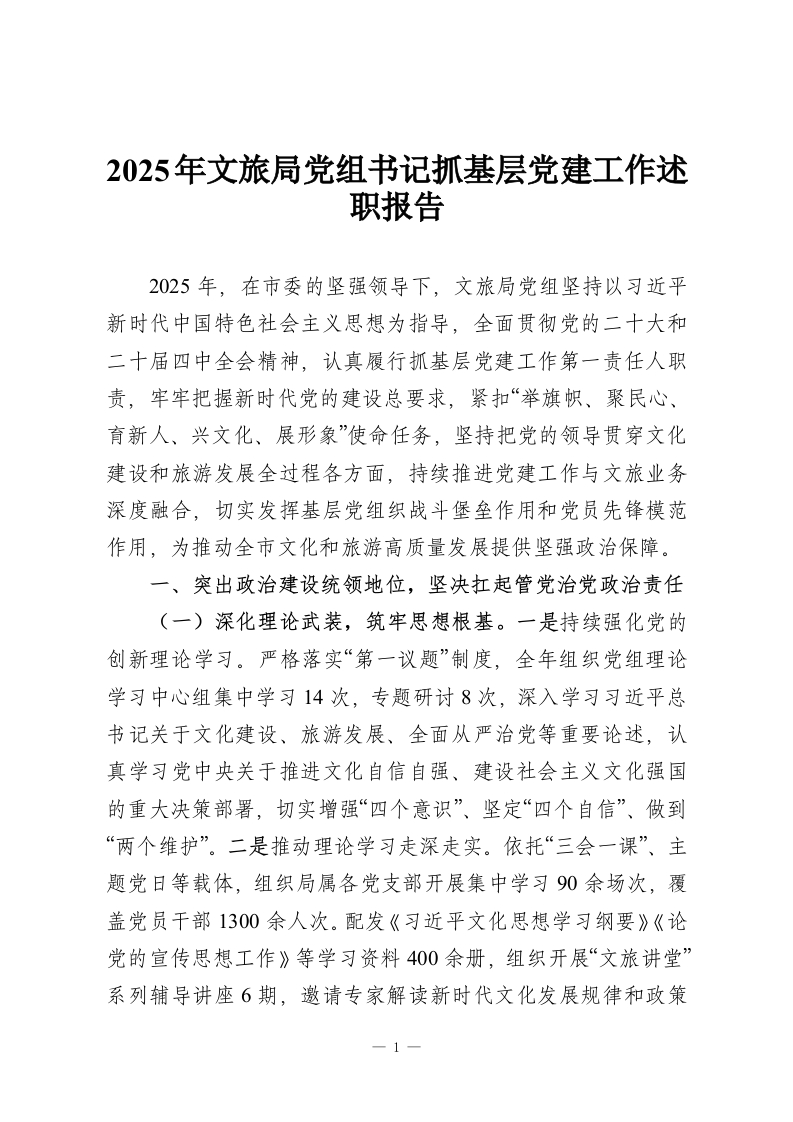 首页学习提升2025年文旅局党组书记抓基层党建工作述职报告