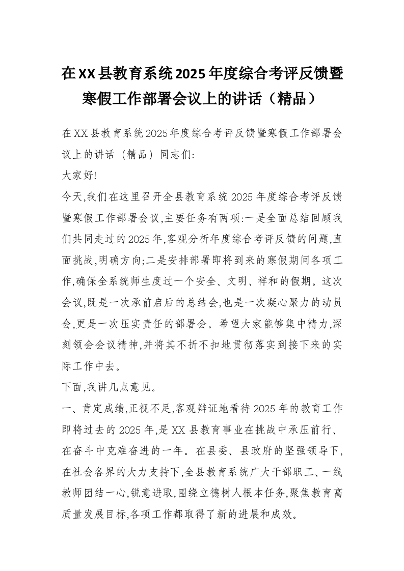 首页精选范文在XX县教育系统2025年度综合考评反馈暨寒假工作部署会议上的讲话(精品)