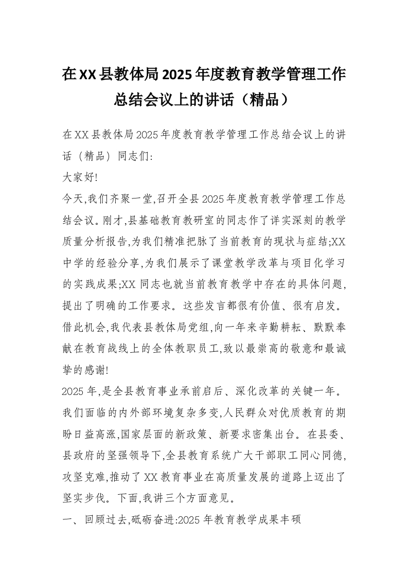 首页精选范文在XX县教体局2025年度教育教学管理工作总结会议上的讲话(精品)