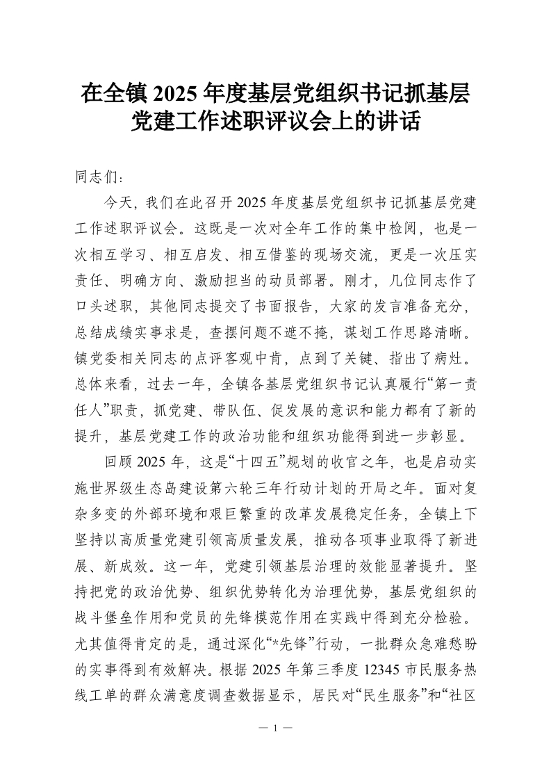 在全镇2025年度基层党组织书记抓基层党建工作述职评议会上的讲话_副本
