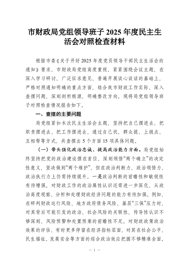 首页工作文档市财政局党组领导班子2025年度民主生活会对照检查材料_副本