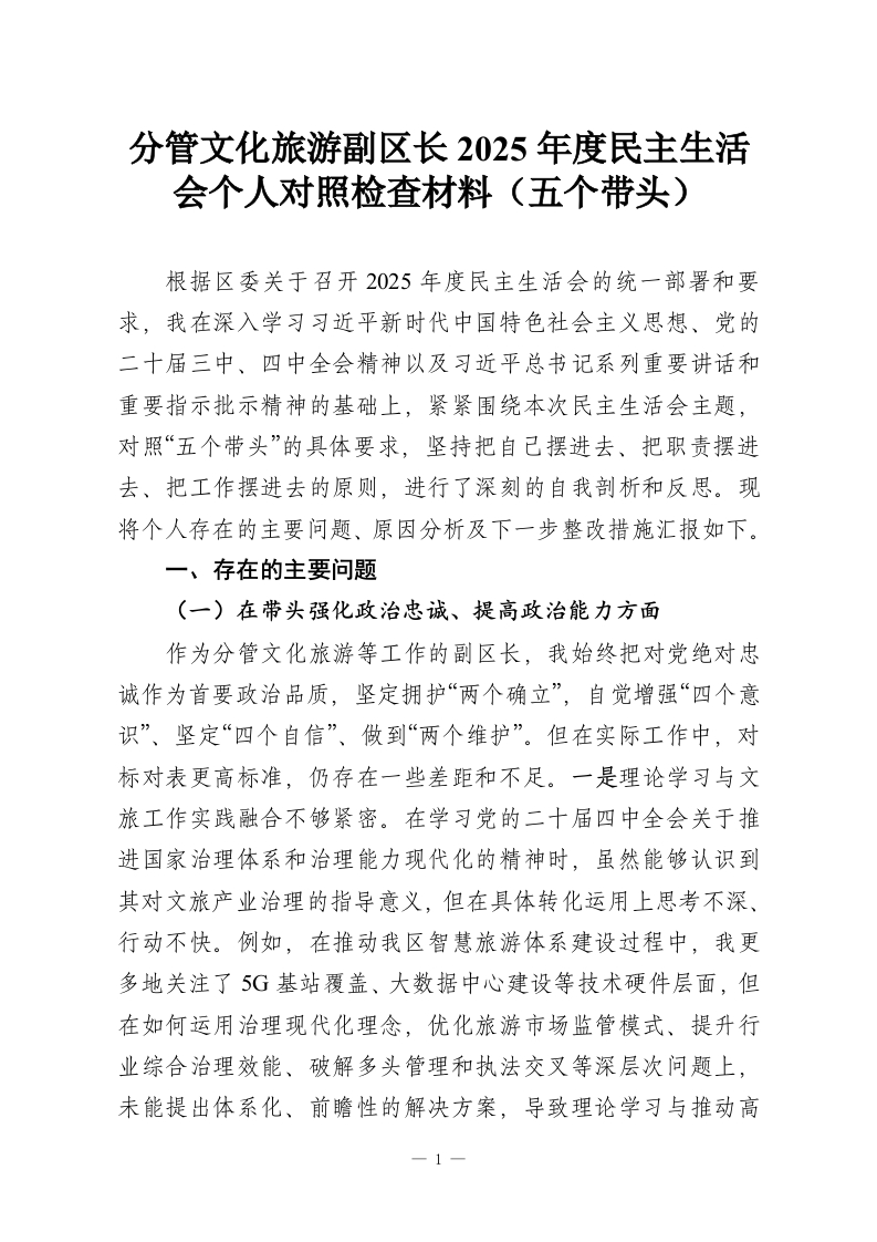 首页工作文档分管文化旅游副区长2025年度民主生活会个人对照检查材料(五个带头)_副本