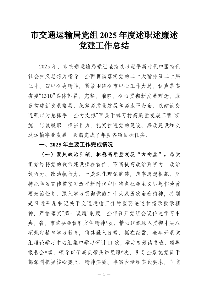 市交通运输局党组2025年度述职述廉述党建工作总结_副本