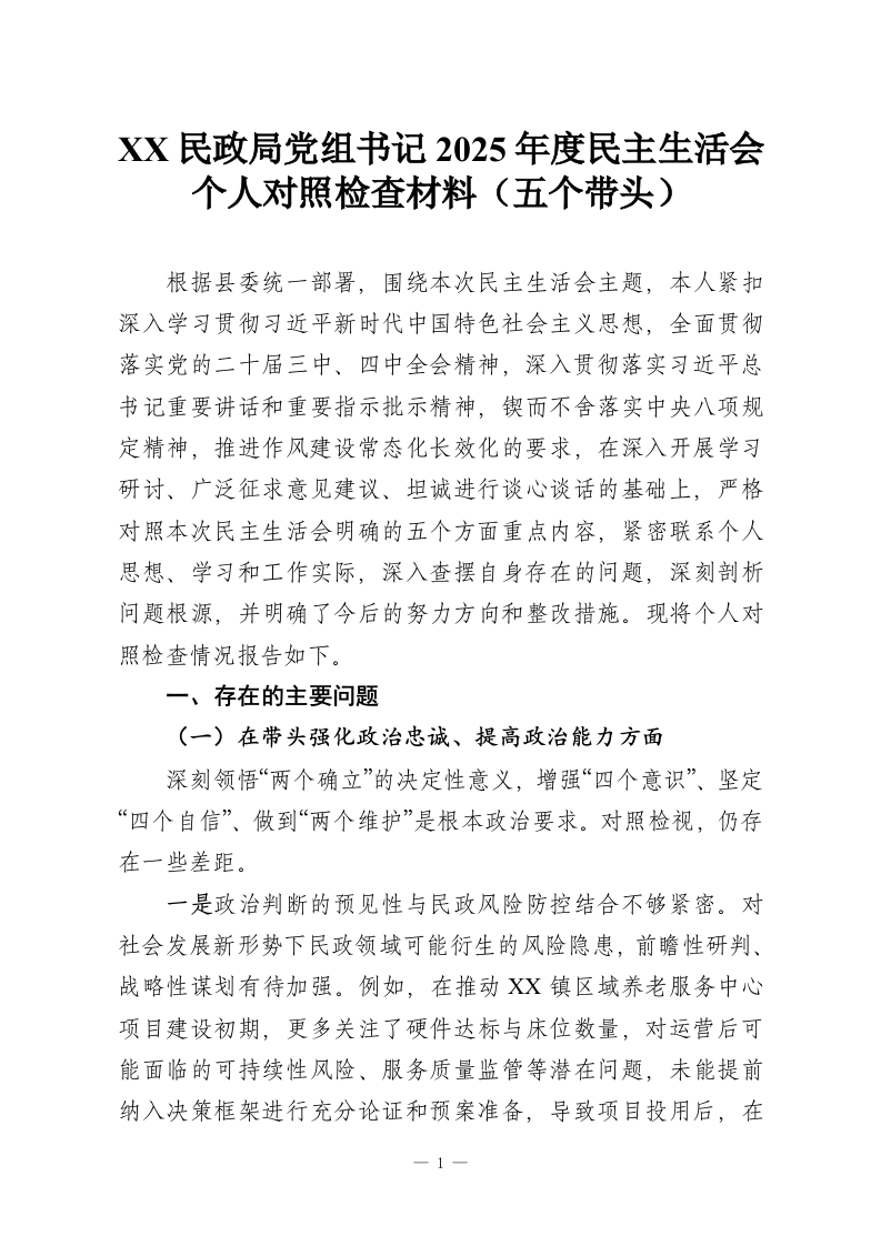 XX民政局党组书记2025年度民主生活会个人对照检查材料(五个带头)_副本