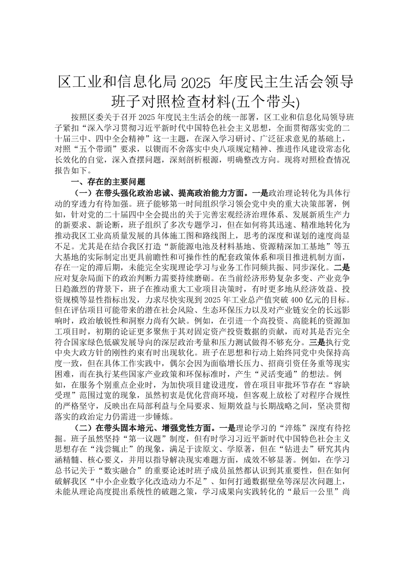 区工业和信息化局2025年度民主生活会领导班子对照检查材料(五个带头)