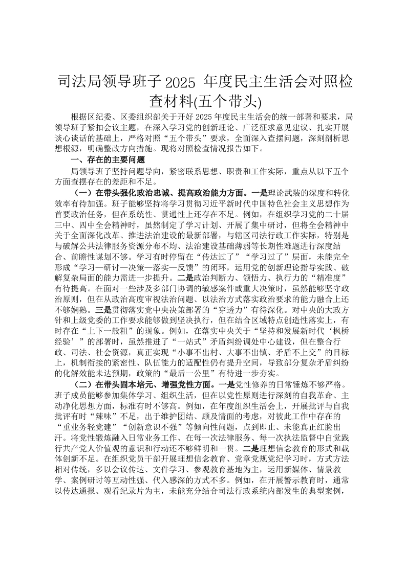 司法局领导班子2025年度民主生活会对照检查材料(五个带头)