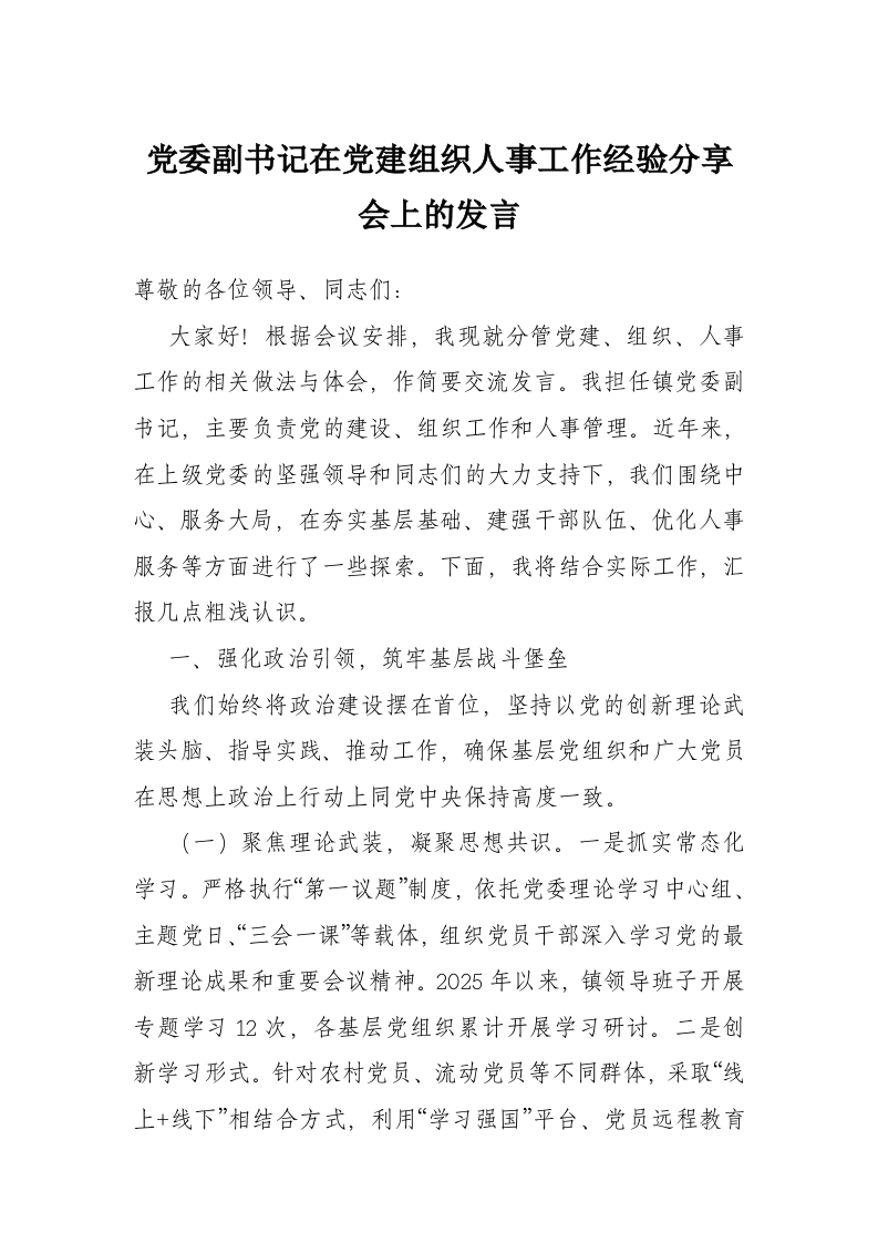 首页讲课讲稿党委副书记在党建组织人事工作经验分享会上的发言